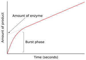 In the figure to the right, the enzyme produces E* rapidly in the first few seconds of the reaction. The rate then slows as steady state is reached. This rapid burst phase of the reaction measures a single turnover of the enzyme. Consequently, the amount of product released in this burst, shown as the intercept on the y-axis of the graph, also gives the amount of functional enzyme which is present in the assay.[39]