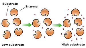 As enzyme-catalysed reactions are saturable, their rate of catalysis does not show a linear response to increasing substrate. If the initial rate of the reaction is measured over a range of substrate concentrations (denoted as [S]), the initial reaction rate () increases as [S] increases, as shown on the right. However, as [S] gets higher, the enzyme becomes saturated with substrate and the initial rate reaches Vmax, the enzyme's maximum rate.