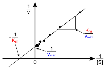 The Lineweaver–Burk plot or double reciprocal plot is a common way of illustrating kinetic data. This is produced by taking the reciprocal of both sides of the Michaelis–Menten equation. As shown on the right, this is a linear form of the Michaelis–Menten equation and produces a straight line with the equation y = mx + c with a y-intercept equivalent to 1/Vmax and an x-intercept of the graph representing −1/KM.