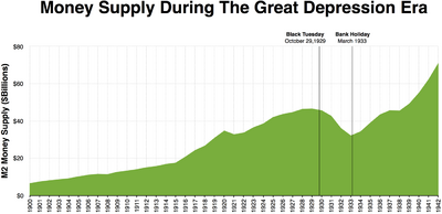 Essentially, in the monetarist view, the Great Depression was caused by the fall of the money supply. Friedman and Schwartz note that "[f]rom the cyclical peak in August 1929 to a cyclical trough in March 1933, the stock of money fell by over a third."[34] The result was what Friedman calls "The Great Contraction"—a period of falling income, prices, and employment caused by the choking effects of a restricted money supply. The mechanism suggested by Friedman and Schwartz was that people wanted to hold more money than the Federal Reserve was supplying. People thus hoarded money by consuming less. This, in turn, caused a contraction in employment and production, since prices were not flexible enough to immediately fall. Friedman and Schwartz argued the Federal Reserve allowed the money supply to plummet because of ineptitude and poor leadership.[35]