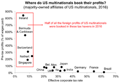 ↑ 8.08.1"Territorial tax" systems have the flexibility to apply much lower tax rates on foreign sourced income to incentivise companies to maintain their headquarters at home (e.g. Germany applies a 5% tax on foreign profits).[72][73] Prior to the 2017 U.S. Tax Cuts and Jobs Act of 2017, the U.S. was one of 7 remaining jurisdictions (i.e. Chile, Greece, Ireland, Israel, South Korea, Mexico and the U.S.), to operate a "worldwide tax" system which applied a fixed single high rate of 35% tax on all worldwide income.[74]