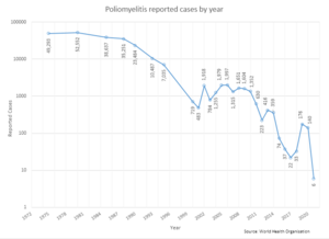 WPV2 was declared eradicated in September 2015 as it has not been seen since 1999 and WPV3 may be eradicated as it has not been seen since 2012. cVDPV type 2 was still causing paralysis in some countries due to a years-long evolution in under-immunized populations.[78]