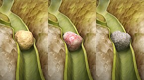 A gallstone is a stone formed within the gallbladder out of bile components.[2] The term cholelithiasis may refer to the presence of gallstones or to any disease caused by gallstones.[5] Most people with gallstones (about 80%) never have symptoms.[2][3] However, if a gallstone blocks the bile duct, a cramp-like pain in the right upper part of the abdomen, known as biliary colic (gallbladder attack) can result.[4] This happens in 1–4% of those with gallstones each year.[4] Complications of gallstones may include inflammation of the gallbladder (cholecystitis), inflammation of the pancreas (pancreatitis), jaundice, and infection of a bile duct (cholangitis).[4][6] Symptoms of these complications may include pain of more than five hours duration, fever, yellowish skin, vomiting, dark urine, and pale stools.[2]