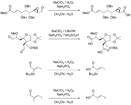 The Pinnick oxidation is an organic reaction by which aldehydes can be oxidized into their corresponding carboxylic acids using sodium chlorite (NaClO2) under mild acidic conditions. It was originally developed by Lindgren and Nilsson.[1] The typical reaction conditions used today were developed by G. A. Kraus.[2][3] H.W. Pinnick later demonstrated that these conditions could be applied to oxidize α,β-unsaturated aldehydes.[4] There exist many different reactions to oxidize aldehydes, but only a few are amenable to a broad range of functional groups. The Pinnick oxidation has proven to be both tolerant of sensitive functionalities and capable of reacting with sterically hindered groups. This reaction is especially useful for oxidizing α,β-unsaturated aldehydes, and another one of its advantages is its relatively low cost.[4][5]