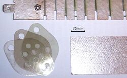 Muscovite and phlogopite splittings can be fabricated into various built-up mica products, also known as micanite. Produced by mechanized or hand setting of overlapping splittings and alternate layers of binders and splittings, built-up mica is used primarily as an electrical insulation material. Mica insulation is used in high-temperature and fire-resistant power cables in aluminium plants, blast furnaces, critical wiring circuits (for example, defense systems, fire and security alarm systems, and surveillance systems), heaters and boilers, lumber kilns, metal smelters, and tanks and furnace wiring. Specific high-temperature mica-insulated wire and cable is rated to work for up to 15 minutes in molten aluminium, glass, and steel. Major products are bonding materials; flexible, heater, molding, and segment plates; mica paper; and tape.[21] Flexible plate is used in electric motor and generator armatures, field coil insulation, and magnet and commutator core insulation. Mica consumption in flexible plate was about 21 tonnes in 2008 in the US. Heater plate is used where high-temperature insulation is required. Molding plate is sheet mica from which V-rings are cut and stamped for use in insulating the copper segments from the steel shaft ends of a commutator. Molding plate is also fabricated into tubes and rings for insulation in armatures, motor starters, and transformers. Segment plate acts as insulation between the copper commutator segments of direct-current universal motors and generators. Phlogopite built-up mica is preferred because it wears at the same rate as the copper segments. Although muscovite has a greater resistance to wear, it causes uneven ridges that may interfere with the operation of a motor or generator. Consumption of segment plate was about 149 t in 2008 in the US. Some types of built-up mica have the bonded splittings reinforced with cloth, glass, linen, muslin, plastic, silk, or special paper. These products are very flexible and are produced in wide, continuous sheets that are either shipped, rolled, or cut into ribbons or tapes, or trimmed to specified dimensions. Built-up mica products may also be corrugated or reinforced by multiple layering. In 2008, about 351 t of built-up mica was consumed in the US, mostly for molding plates (19%) and segment plates (42%).[21]