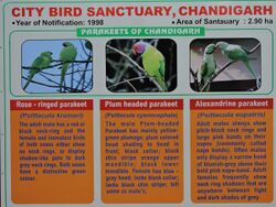 City Bird Sanctuary Chandigarh or Parrot Bird Sanctuary Chandigarh is a bird sanctuary situated in sector 21 of the city of Chandigarh, India .[1] It is primarily habitat of parrots. Hundreds of parrots live here. They fly in flocks in the morning and evening from here. There are two parks adjoining to this sanctuary. Flocks of parrots sit on the trees of these parks also. It is the second wildlife sanctuary of Chandigarh. Sukhna wildlife sanctuary near Sukhna Lake is another wildlife sanctuary of the city. It is notified under Section 18 of the Wildlife (Protection) Act, 1972.