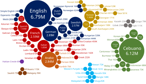 Cartogram showing number of articles in each language as of March 2024.[update] Languages with fewer than 1,000,000 articles are represented by one circle. Languages are grouped by region of continent and each region of continent is presented by a separate color.