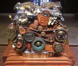 In 2012, the conceptual artist Eric Van Hove arrived in Marrakech to resume work on an ambitious sculptural endeavor he had prepared for years: V12 Laraki. In the space of nine months, he gathered around him 42 master craftsmen from the region and began rebuilding a Mercedes 6.2 L V12 engine using rural materials and centuries old craft techniques from the North African country. Conceptually, this sculpture is based on the story of the Laraki Fulgura, which was entirely manufactured in Morocco to the exception of its engine. The artist decided to try and reproduce that cutting-edge component locally using craft[7] That sculpture was displayed at the 5th Marrakech Biennale and soon acquired by the Hood Museum of Art.[8]