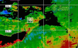 The thermal night recording on January 6, 21 and 28, 2001 in the Gujarat region of India. Marked with an asterisk is the epicenter of the Bhuj earthquake on January 26 that was of 7.9 magnitude. The intermediate recording reveals a thermal anomaly on January 21 which is shown in red. In the next recording, 2 days after the earthquake, the thermal anomaly has disappeared.