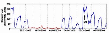 Rozhnoi, A.; Solovieva, M.; Molchanov, O.; Schwingenschuh, K.; Boudjada, M.; Biagi, P. F.; Maggipinto, T.; Castellana, L. et al. (2009-10-21), "Anomalies in VLF radio signals prior the Abruzzo earthquake (M=6.3) on 6 April 2009", Natural Hazards and Earth System Sciences9 (5): 1727–1732, doi:10.5194/nhess-9-1727-2009, ISSN 1561-8633, Bibcode: 2009NHESS...9.1727R, https://www.nat-hazards-earth-syst-sci.net/9/1727/2009/