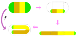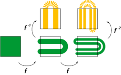 The horseshoe map f is a diffeomorphism defined from a region S of the plane into itself. The region S is a square capped by two semi-disks. The codomain of [math]\displaystyle{ f }[/math] (the "horseshoe") is a proper subset of its domain [math]\displaystyle{ S }[/math]. The action of f is defined through the composition of three geometrically defined transformations. First the square is contracted along the vertical direction by a factor a < 1/2. The caps are contracted so as to remain semi-disks attached to the resulting rectangle. Contracting by a factor smaller than one half assures that there will be a gap between the branches of the horseshoe. Next the rectangle is stretched horizontally by a factor of 1/a; the caps remain unchanged. Finally the resulting strip is folded into a horseshoe-shape and placed back into S.