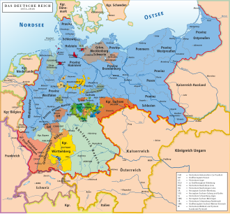 The German Empire, also sometimes known as the Second Reich or the Deutsches Kaiserreich, was the German state that existed between the unification of Germany in 1871 and the abdication of Wilhelm II after the German Revolution in 1918.