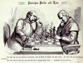 Open conflict between Bismarck and the Church began right away in the summer of 1871 when Bismarck forbade priests from preaching politics at the pulpit; in 1872 he then made all religious schools subject to state inspection.[15] To Americans this just sounds like basic separation of church and state, but these policies were strongly resisted by Germany's Catholics. Bismarck redoubled his efforts, dissolving the Jesuit order, severing diplomatic relations with The Vatican, and making the Church's ecclesiastical appointments subject to state authority.[15]