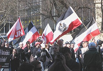 Although the empire is long fallen, its historical position as a powerful and militaristic force for conservatism still captures the minds of the far-right in Germany and abroad. The black-white-red colors of the Imperial German flag were associated with the far-right and fascist elements of Weimar German politics, and this color scheme was also used for the Nazi German flag.[73] The Freikorps, a paramilitary infamous for its actions during the German Revolution, also used the Reichskriegsflagge (Imperial War Flag) to rally its members.[74][75] At the Beer Hall Putsch, Heinrich Himmler wielded the flag.[74]