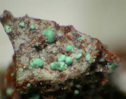 Copper(II) chloride occurs naturally as the very rare anhydrous mineral tolbachite and the dihydrate eriochalcite.[29] Both are found near fumaroles and in some copper mines.[30][31][32] Mixed oxyhydroxide-chlorides like atacamite (Cu2(OH)3Cl) are more common, arising among Cu ore beds oxidation zones in arid climates.[33]