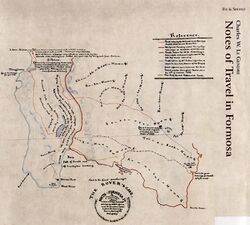 Le Gendre quickly assumed de facto command of the mission from General Liu in the course of a long and difficult march into deep aboriginal lands in southern Taiwan (some of which required extensive road construction). Then, with the aid of William A. Pickering and James Horn, Le Gendre negotiated a Memorandum of the Understanding with Tauketok [22] (南岬之盟) guaranteeing the safety of shipwrecked American and European sailors with Tok-a-Tok[23] (c. 1817–1874),[lower-alpha 1][24] the chief of 18 Paiwan aboriginal tribes in the area when the Rover had gone ashore.[25][26][27]