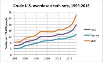 In 2016, over 64,000 Americans died from overdoses, 21 percent more than the almost 53,000 in 2015.[9][11][12] By comparison, the figure was 16,000 in 2010, and 4,000 in 1999.[13][14] While death rates varied by state,[15] public health experts estimate that nationwide over 500,000 people could die from the epidemic over the next 10 years.[16] In Canada , half of the overdoses were accidental, while a third were intentional. The remainder were unknown.[17] Many of the deaths are from an extremely potent opioid, fentanyl, which is trafficked from Mexico.[18] The epidemic cost the United States an estimated $504 billion in 2015.[19]