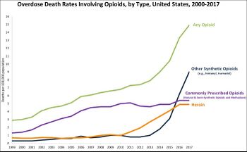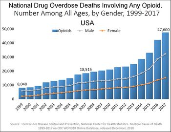 The opioid epidemic or opioids crisis is the rapid increase in the use of prescription and non-prescription opioid drugs in the United States and Canada beginning in the late 1990s and continuing throughout the next two decades. The increase in opioid overdose deaths has been dramatic, and opioids are now responsible for 49,000 of the 72,000 drug overdose deaths overall in the US in 2017.[2] A recent report indicated that the rate of prolong opioid use is increasing globally.[4] Opioids are a diverse class of moderately strong painkillers, including oxycodone (commonly sold under the trade names OxyContin and Percocet), hydrocodone (Vicodin, Norco), and a very strong painkiller, fentanyl, which is synthesized to resemble other opiates such as opium-derived morphine and heroin.