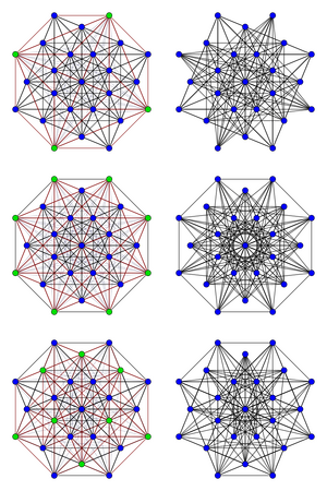 ![]() The three Chang graphs (right), and the switching sets generating them from the line graph L(K8) (green, left) | |