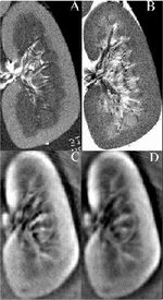 Thermoacoustic imaging was originally proposed by Theodore Bowen in 1981 as a strategy for studying the absorption properties of human tissue using virtually any kind of electromagnetic radiation.[1] But Alexander Graham Bell first reported the physical principle upon which thermoacoustic imaging is based a century earlier.[2] He observed that audible sound could be created by illuminating an intermittent beam of sunlight onto a rubber sheet. Shortly after Bowen's work was published, other researchers proposed methodology for thermoacoustic imaging using microwaves.[3] In 1994 researchers used an infrared laser to produce the first thermoacoustic images of near-infrared optical absorption in a tissue-mimicking phantom, albeit in two dimensions (2D).[4] In 1995 other researchers formulated a general reconstruction algorithm by which 2D thermoacoustic images could be computed from their "projections," i.e. thermoacoustic computed tomography (TCT).[5] By 1998 researchers at Indiana University Medical Center[6] extended TCT to 3D and employed pulsed microwaves to produce the first fully three-dimensional (3D) thermoacoustic images of biologic tissue [an excised lamb kidney (Fig. 1)].[7] The following year they created the first fully 3D thermoacoustic images of cancer in the human breast, again using pulsed microwaves (Fig. 2).[8] Since that time, thermoacoustic imaging has gained widespread popularity in research institutions worldwide.[9][10][11][12][13][14][15] As of 2008, three companies were developing commercial thermoacoustic imaging systems – Seno Medical,[16] Endra, Inc.[17] and OptoSonics, Inc.[18]