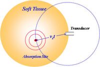 The typical acoustic detector is an ultrasound transducer, which is commonly made of a piezo-electric material that converts detected pressure to an electrical signal. Thermoacoustic waves are induced within the anatomy wherever absorption takes place, and the strength of these thermoacoustic waves is proportional to the energy absorbed within the tissue. Some of these waves propagate through the anatomy over some time interval (time-of-flight) before being detected by one or more of the acoustic transducers. The exact time-of-flight is proportional to the distance between an absorption site and a transducer, assuming for the moment that each transducer is a point detector. For any given time-of-flight, each transducer will receive the sum of the thermoacoustic waves originating at the same distance from the detector in question as is illustrated in Fig. 5. For this reason, ambiguity arises when attempting to localize an absorption site with a point transducer. A variety of strategies have been employed to mitigate this ambiguity.