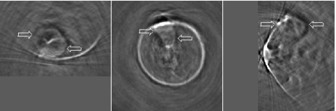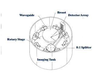Microwaves have also been used to form 3D thermoacoustic images of the human breast. One of the first devices to do so is depicted in Fig. 10. It consisted of an array of eight waveguides, which directed microwave energy into the breast. A transducer array was rotated in synchrony with the waveguides in order to acquire sufficient data to reconstruct the internal structures of the breast. Figure 11 shows an animation of the typical glandular tissue pattern in a normal breast.