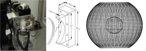 In order to capture sufficient thermoacoustic data to form an accurate 3D map of electromagnetic absorption, it is necessary to surround the anatomy being imaged with a 2D array of transducers. The world's first 3D thermoacoustic animal scanner (Fig. 8: left panel) accomplished this by combining a cylindrical array of 128 transducers (Fig. 8: center panel) with rotation of the animal being imaged about the vertical axis. The net result was to capture thermoacoustic data over the surface of a sphere surrounding the animal being imaged (Fig. 8: right panel).[21] This device was capable of visualizing structures as small as 1/3 millimeter. An animated 3D image of the vasculature in the head of a mouse is displayed in Fig. 9. This animated image was acquired using near infrared radiation at 800 nm, where optical absorption by blood is higher than surrounding tissues. Therefore, the vasculature is preferentially visualized.