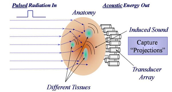 Sound, which propagates as a pressure wave, can be induced in virtually any material, including biologic tissue, whenever time-varying electromagnetic energy is absorbed. The stimulating radiation that induces these thermally generated acoustic waves may lie anywhere in the electromagnetic spectrum, from high-energy ionizing particles to low-energy radio waves. The term "photoacoustic" (see photoacoustic imaging in biomedicine) applies to this phenomenon when the stimulating radiation is optical, while "thermoacoustic" is the more general term and refers to all radiating sources, including optical.