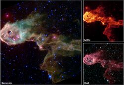 GLIMPSE, the Galactic Legacy Infrared Mid-Plane Survey Extraordinaire, was a series of surveys that spanned 360° of the inner region of the Milky Way galaxy, which provided the first large-scale mapping of the galaxy.[45][46] It consists of more than 2 million snapshots taken in four separate wavelengths using the Infrared Array Camera.[47] The images were taken over a 10-year period beginning in 2003 when Spitzer launched.[48]