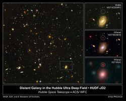 Reported in March 2016, Spitzer and Hubble were used to discover the most distant-known galaxy, GN-z11. This object was seen as it appeared 13.4 billion years ago.[60][25]