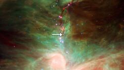 Spitzer observations, announced in May 2011, indicate that tiny forsterite crystals might be falling down like rain on to the protostar HOPS-68. The discovery of the forsterite crystals in the outer collapsing cloud of the protostar is surprising because the crystals form at lava-like high temperatures, yet they are found in the molecular cloud where the temperatures are about −170 °C (103 K; −274 °F). This led the team of astronomers to speculate that the bipolar outflow from the young star may be transporting the forsterite crystals from near the star's surface to the chilly outer cloud.[54][55]