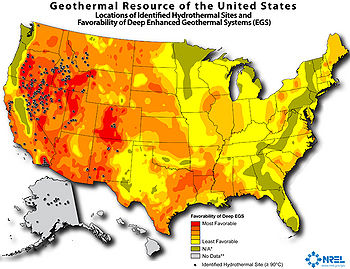 In the United States, as noted above, most geothermal power plants are located in the western states.[9] California produces the most electricity from geothermal,[9] with installed capacity estimated to 2,732.2 MW in 2012, while the USA’s second leading geothermal state, Nevada, reached 517.5 MW.[8] There are a number of geothermal plants concentrated in south central California, on the southeast side of the Salton Sea, near the cities of Niland and Calipatria, California. The Basin and Range geologic province in Nevada, southeastern Oregon, southwestern Idaho, Arizona, and western Utah is now an area of rapid geothermal development.