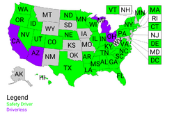 In June 2011, the Nevada Legislature passed a law to authorize the use of automated cars. Nevada thus became the first jurisdiction in the world where automated vehicles might be legally operated on public roads. According to the law, the Nevada Department of Motor Vehicles (NDMV) is responsible for setting safety and performance standards and the agency is responsible for designating areas where automated cars may be tested.[230][231][232] This legislation was supported by Google in an effort to legally conduct further testing of its Google driverless car.[233] The Nevada law defines an automated vehicle to be "a motor vehicle that uses artificial intelligence, sensors and global positioning system coordinates to drive itself without the active intervention of a human operator". The law also acknowledges that the operator will not need to pay attention while the car is operating itself. Google had further lobbied for an exemption from a ban on distracted driving to permit occupants to send text messages while sitting behind the wheel, but this did not become law.[233][234][235] Furthermore, Nevada's regulations require a person behind the wheel and one in the passenger's seat during tests.[236]
