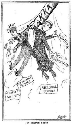 Catholic writers such as Ernest Jouin, who published the Protocols in French, seamlessly blended racial and religious anti-Semitism, as in his statement that "from the triple viewpoint of race, of nationality, and of religion, the Jew has become the enemy of humanity."[75] Pope Pius XI praised Jouin for "combating our mortal [Jewish] enemy" and appointed him to high papal office as a protonotary apostolic.[76][75]