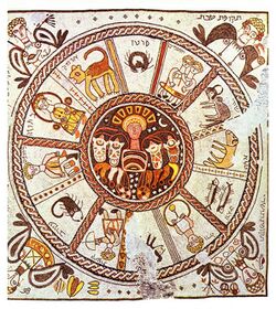 A mosaic floor in Hamat Tiberias presents David as Helios surrounded by a ring with the signs of the zodiac.[58] As well as in Hamat Tiberias, figures of Helios or Sol Invictus also appear in several of the very few surviving schemes of decoration surviving from Late Antique synagogues, including Beth Alpha, Husefa, all now in Israel, and Naaran in the West Bank. He is shown in floor mosaics, with the usual radiate halo, and sometimes in a quadriga, in the central roundel of a circular representation of the zodiac or the seasons. These combinations "may have represented to an agricultural Jewish community the perpetuation of the annual cycle of the universe or ... the central part of a calendar". [59](pp370, 375)