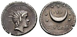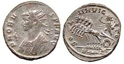 Coin of Emperor Probus, c. 280, with Sol Invictus riding a quadriga, with legend SOLI INVICTO, "to the Unconquered Sun": the Emperor (at left) wears a radiated solar crown, worn also by the god on the obverse |