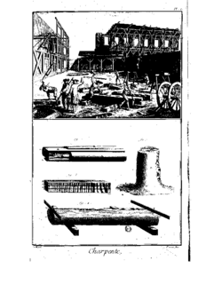 Illustration of carpentry (charpente) in the French Encyclopédie showing hewing, mortising, pit sawing on trestles. Tools include