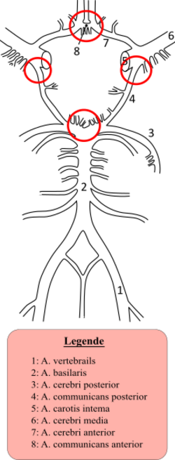 In 85 percent of spontaneous cases the cause is a cerebral aneurysm—a weakness in the wall of one of the arteries in the brain that becomes enlarged. They tend to be located in the circle of Willis and its branches. While most cases are due to bleeding from small aneurysms, larger aneurysms (which are less common) are more likely to rupture.[4] Aspirin also appears to increase the risk.[24]