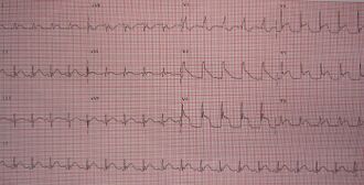 Electrocardiographic changes are relatively common in subarachnoid hemorrhage, occurring in 40–70 percent of cases. They may include QT prolongation, Q waves, cardiac dysrhythmias, and ST elevation that mimics a heart attack.[37]