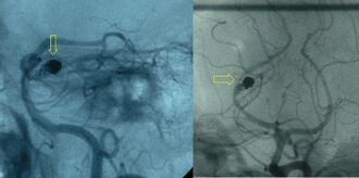 After a subarachnoid hemorrhage is confirmed, its origin needs to be determined. If the bleeding is likely to have originated from an aneurysm (as determined by the CT scan appearance), the choice is between cerebral angiography (injecting radiocontrast through a catheter to the brain arteries) and CT angiography (visualizing blood vessels with radiocontrast on a CT scan) to identify aneurysms. Catheter angiography also offers the possibility of coiling an aneurysm (see below).[4][30]