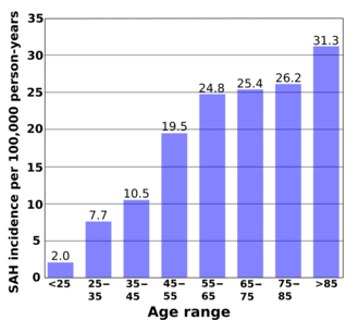 Although the group of people at risk for SAH is younger than the population usually affected by stroke,[84] the risk still increases with age. Young people are much less likely than middle-age people (risk ratio 0.1, or 10 percent) to have a subarachnoid hemorrhage.[90] The risk continues to rise with age and is 60 percent higher in the very elderly (over 85) than in those between 45 and 55.[90] Risk of SAH is about 25 percent higher in women over 55 compared to men the same age, probably reflecting the hormonal changes that result from the menopause, such as a decrease in estrogen levels.[90]