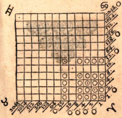Location arithmetic uses a square grid where each square on the grid represents a value. Two sides of the grid are marked with increasing powers of two. Any inner square can be identified by two numbers on these two sides, one being vertically below the inner square and the other to its far right. The value of the square is the product of these two numbers.