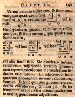 This process requires one to add counters to the abacus (board) to make square figures. The top of page 149 shows diagrams that explain this process. Begin by placing a single counter on the board (it will actually go on one of the dotted squares). Adding three other counters adjacent (or with blank rows and columns between them and the first one placed) will result in another square figure on the abacus. Similarly adding another five counters to this (with or without the blank rows and columns shown) will result in an even bigger square. Take the number to be considered and put counters along one margin that represent its value. From the position of the largest counter in that value, follow the diagonal lines (bishop’s moves) across the board until you come to a square with a dot. Place a counter on that square. Subtract the value represented by this single counter from the original number in the margin. Add three (five, seven, ... for subsequent steps) to create a square on the board and subtract the value of the added counters from the number in the margin until the number is either too large to be subtracted or there is no space left on the board. You should be left with a large square of counters (perhaps with blank rows and columns between them) on the board. Move one of the counters in each row of the square to the margin and the positions of these marginal counters will yield the square root of the number.