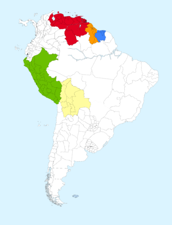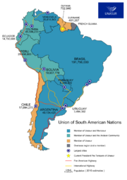 The Union of South American Nations (USAN),[lower-alpha 1] sometimes also referred to as the South American Union, abbreviated in Spanish as UNASUR and in Portuguese as UNASUL, is an intergovernmental regional organization set up by Hugo Chavez to counteract the influence of the United States in the region.[3] It once comprised twelve South American countries; as of 2019, most have withdrawn.