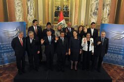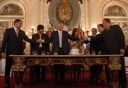 The first Union summit was held in Brasilia on 23 May 2008, in which the Constitutive Treaty was signed. Due to the political crisis that Bolivia faced, pro-tempore president Michelle Bachelet convened an emergency summit in Santiago, Chile, on 15 September 2008. The leaders of Argentina, Bolivia, Brazil and Brazil took part in this summit, in addition to President Michelle Bachelet, Colombia, Ecuador, Paraguay, Uruguay and Venezuela and the Secretary General of the OAS, José Miguel Insulza.[65] After a six-hour meeting between the leaders in the Palacio de La Moneda, they finally declared their support for President Evo Morales's government and gave "its absolute support to Bolivia."[66]