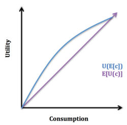 The graph below illustrates the expected utility model, in which U(c) is increasing in and concave in c. This shows that there are diminishing marginal returns associated with consumption, as each additional unit of consumption adds less utility. The expected utility model states that individuals want to maximize their expected utility, as defined as the weighted sum of utilities across states of the world. The weights in this model are the probabilities of each state of the world happening.[5] According to the "more is better" principle, the first order condition will be positive; however, the second order condition will be negative, due to the principle of diminishing marginal utility.[6] Due to the concave actual utility, marginal utility decreases as consumption increase; as a result, it is favorable to reduce consumption in states of high income to increase consumption in low income states.