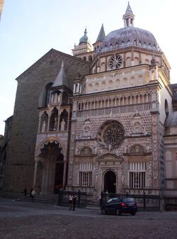 The Colleoni Chapel was built as a mausoleum for the condottiero Bartolomeo Colleoni, with a layout that again echoed Brunelleschi's Sacrestia Vecchia. The plan is square, surmounted by a segmented dome with octagonal drum and scarsella with the altar, also covered by a small dome. However, the structural clarity was enriched with pictorial motifs, especially on the facade, with the use of a white/pink/purple trichromy and the lozenge motif.[10]