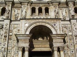 The most significant works of the period developed the trend toward covering Renaissance architecture with exuberant decoration, as had already happened in part at the Ospedale Maggiore, with a crescendo that had a first culmination in the Colleoni Chapel in Bergamo (1470-1476) and a second in the façade of the Certosa di Pavia (from 1491), both by Giovanni Antonio Amadeo along with others.[10]