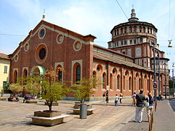 The other major project to which Bramante devoted himself was the reconstruction of the tribune of Santa Maria delle Grazie, which was transformed despite the fact that work on the complex conducted by Guiniforte Solari had been completed just ten years before: Il Moro wished to give a more monumental appearance to the Dominican basilica, to make it the burial place of his own family.[12] The naves built by Solari, immersed in half-light, were illuminated by the monumental tribune at the intersection of the arms, covered by a hemispherical dome. Bramante also added two large side apses and a third, beyond the choir, in axis with the naves. The orderly arrangement of spaces is also reflected on the exterior in an interlocking pattern of volumes that culminates in the tiburium that covers the dome, with a loggia that harkens back to the motifs of early Christian and Lombard Romanesque architecture.[12]