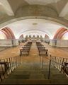 Concordantly attributed to Bramante is the planimetric design of the imposing Pavia Cathedral (of which the wooden model from 1497 is also preserved), based on the grafting of an octagonal domed core with a longitudinal body with three naves, as in the cathedral of Santa Maria del Fiore in Florence or in the Sanctuary of the Holy House of Loreto, then under construction and with which Bramante was probably familiar. The crypt (finished in 1492) and the basement part of the apse area of the building are attributed to Bramante's design, in addition to the general plan scheme.[13]